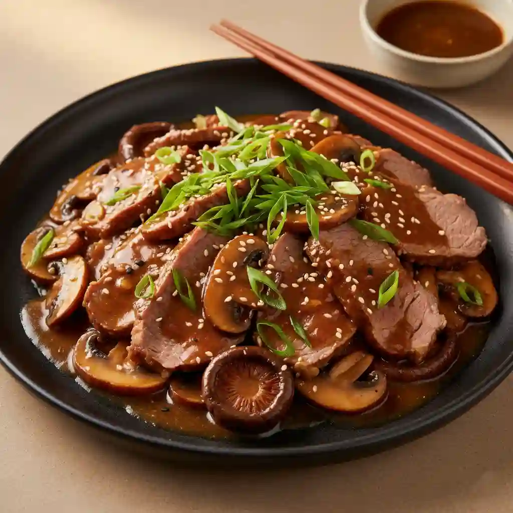 Roast lamb and mushrooms in savory sauce, earthy, rich, and comforting